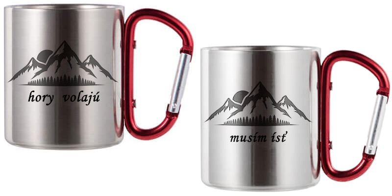 Nerezový hrnček s červenou karabínou.