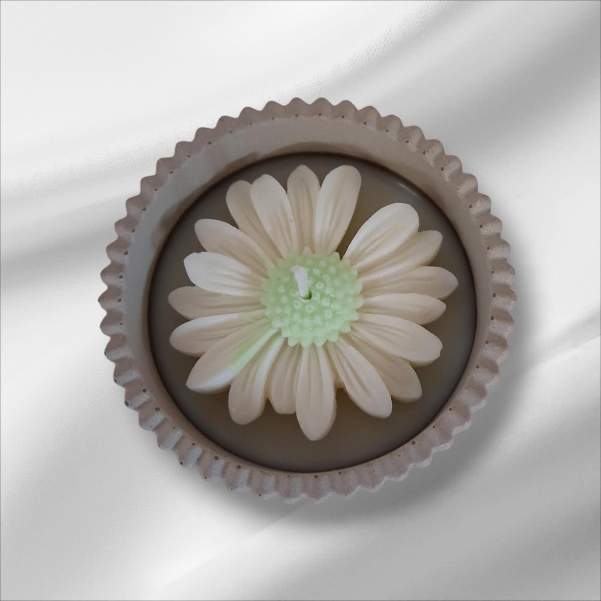 Ručne vyrobená sójová vonná sviečka s dizajnom zeleno-bielej margaréty s kvetovou vôňou. Táto sviečka je odlievaná do betónovej misky. Priemer misky je 8,2 cm.